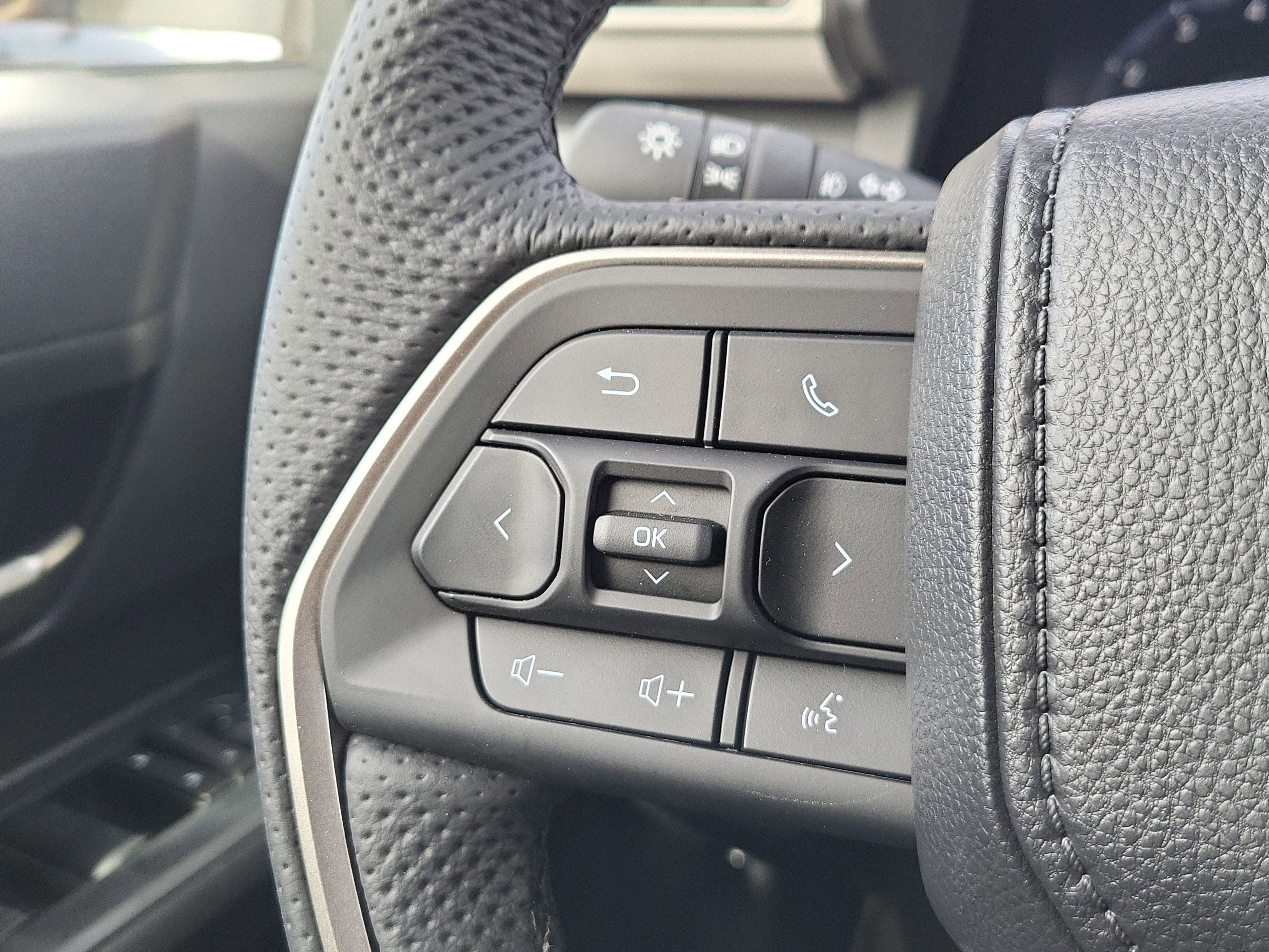 - Leather-trimmed manual tilt/telescopic steering wheel with phone, audio, display/infotainment, and Driver Assist controls