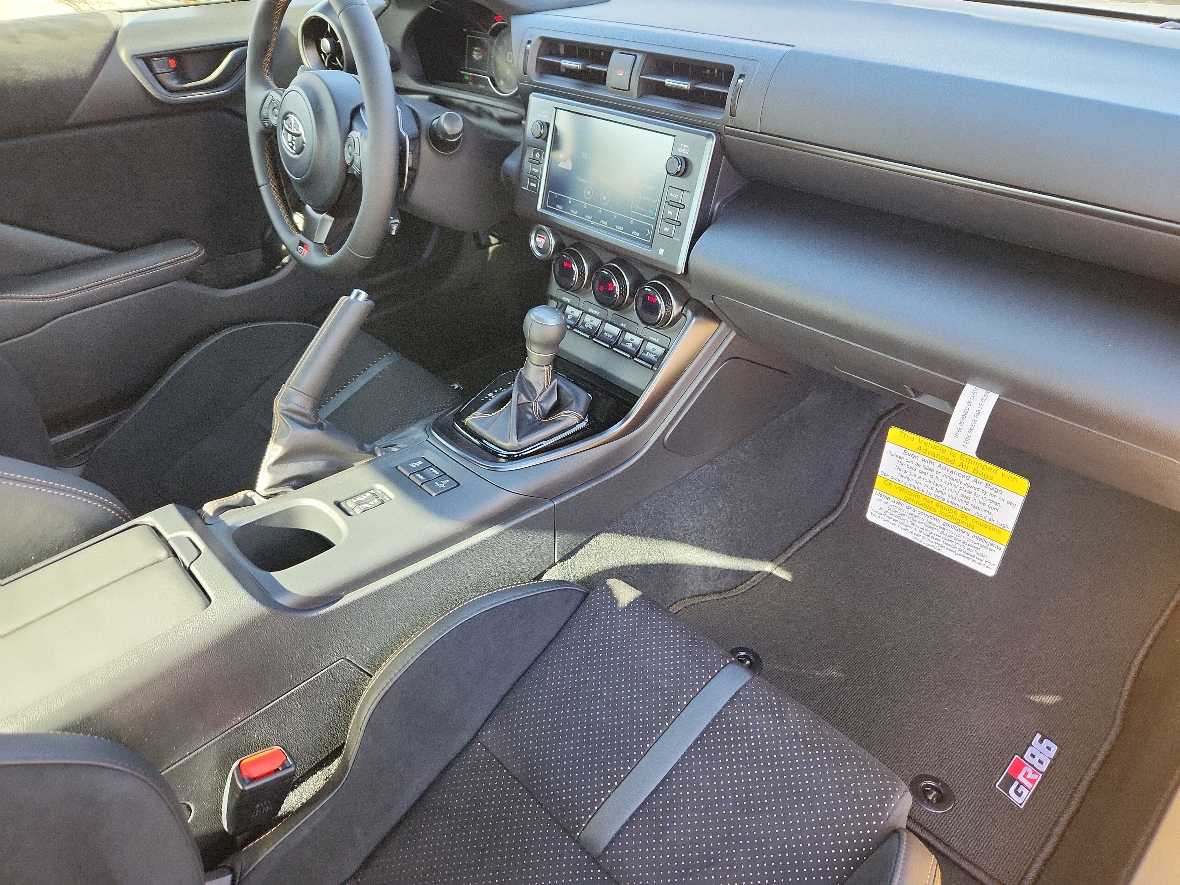 - GR86 Audio—includes 8-in. touchscreen, eight speakers including amplifier, Apple CarPlay® & Android Auto™ compatibility, SiriusXM® 3-month trial subscription. See toyota.com/audio-multimedia for details.